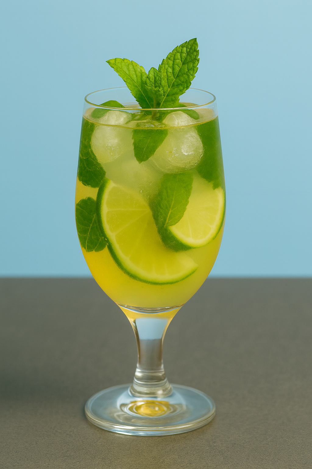 - Garnish and serve. Stir gently and garnish with a sprig of mint and a lime wedge.